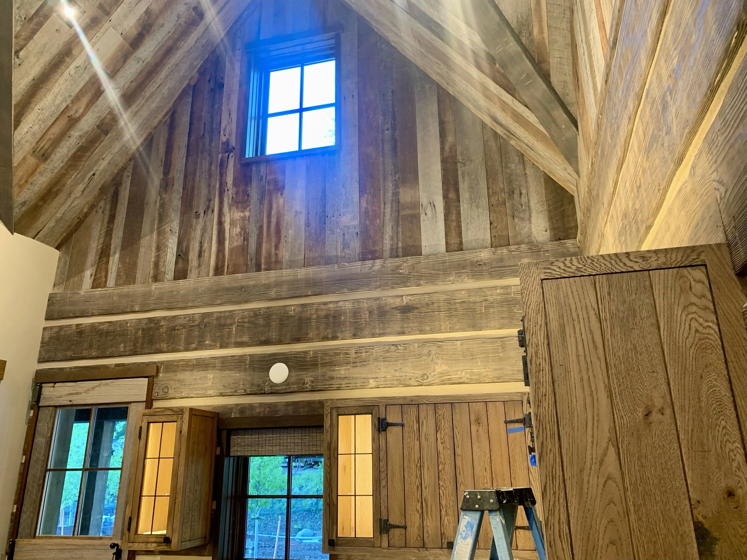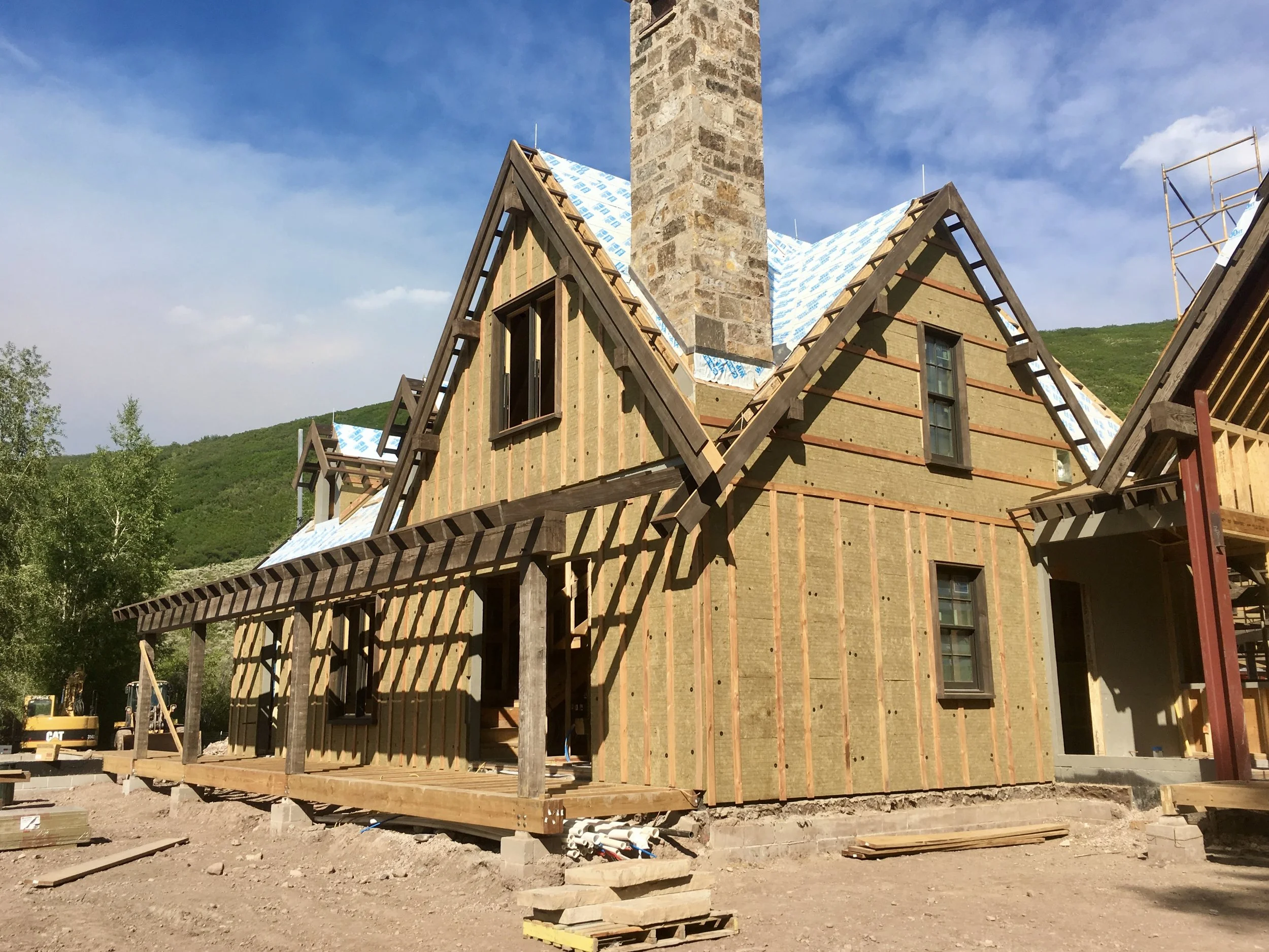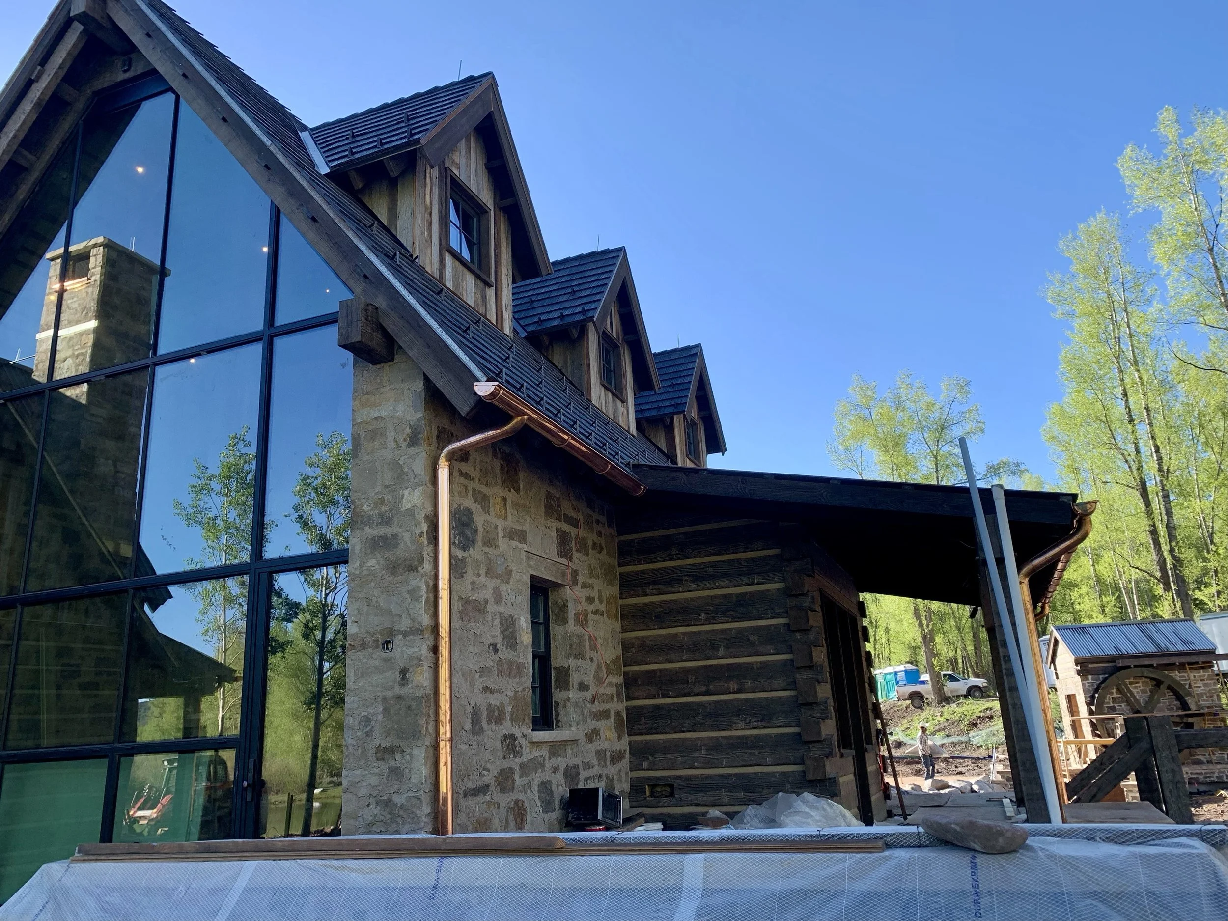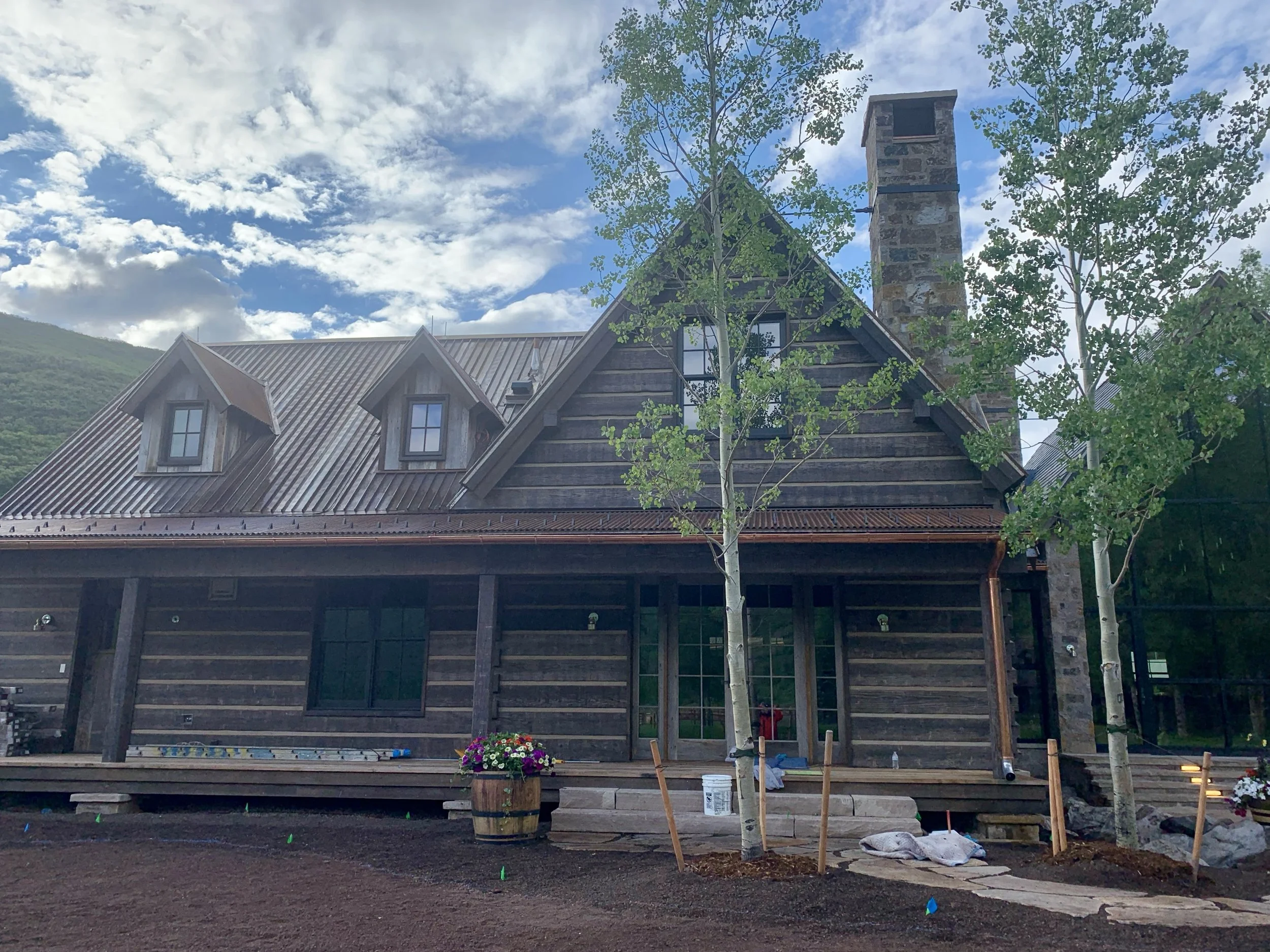 This cabin in Snowmass, Colorado, features a rustic design with wood siding and a stone chimney. Gabled roofs with dormer windows and a large front porch complete the mountain retreat look.