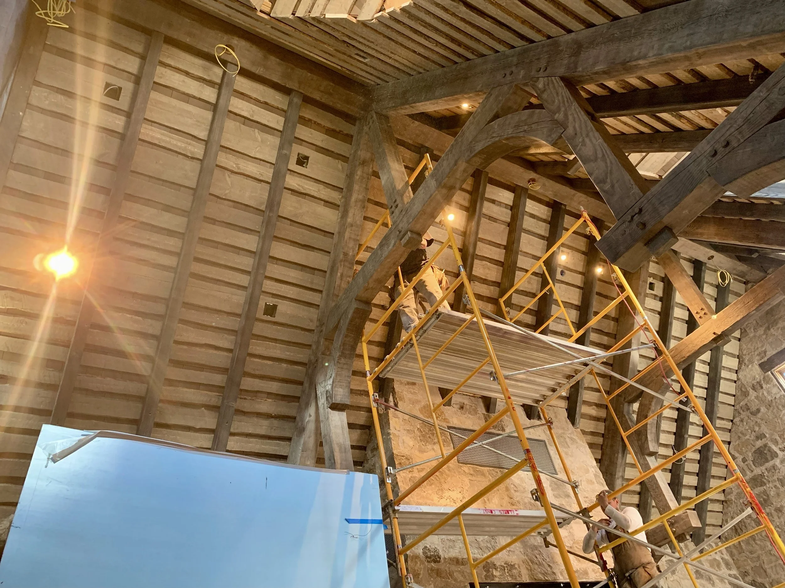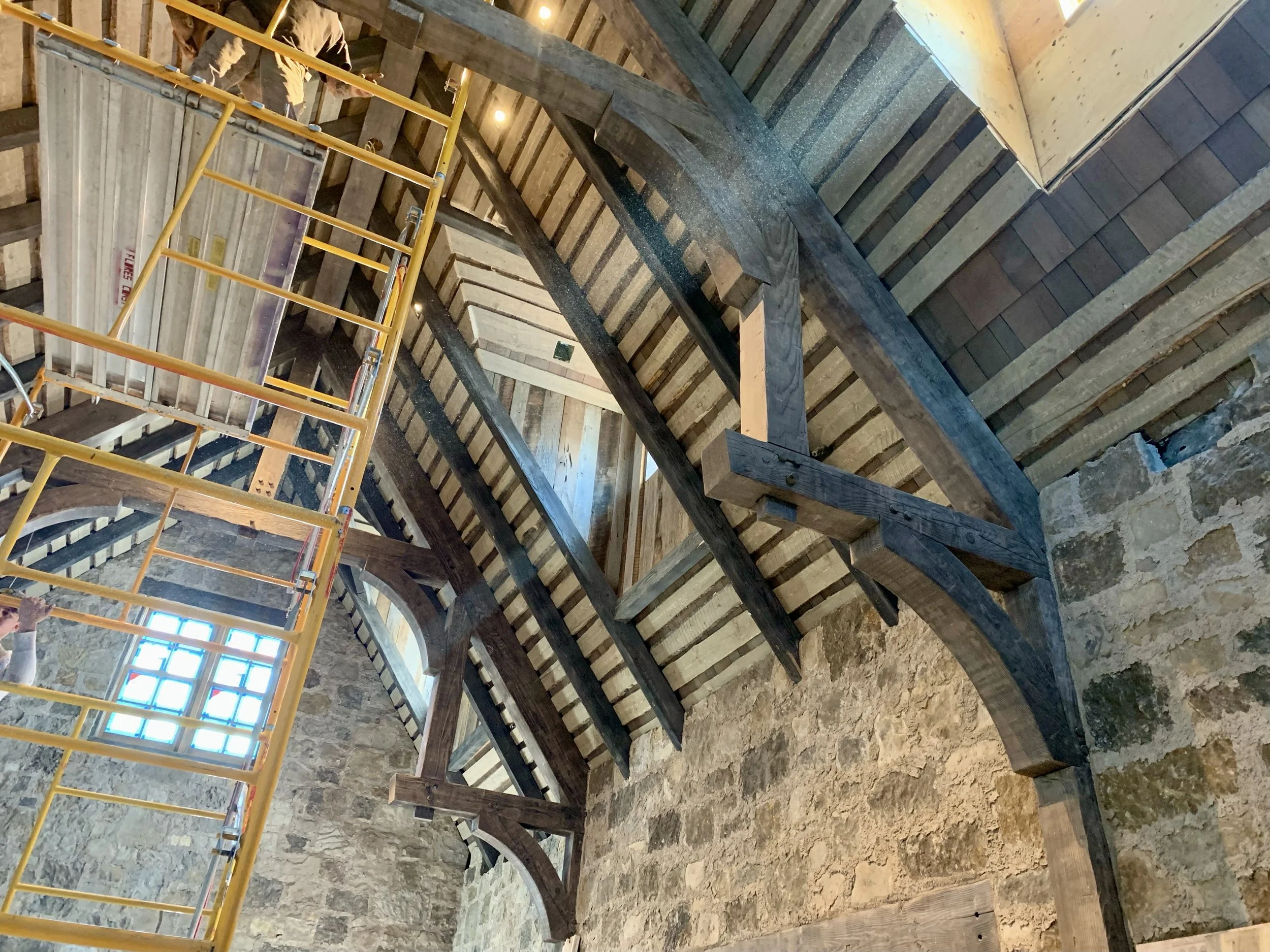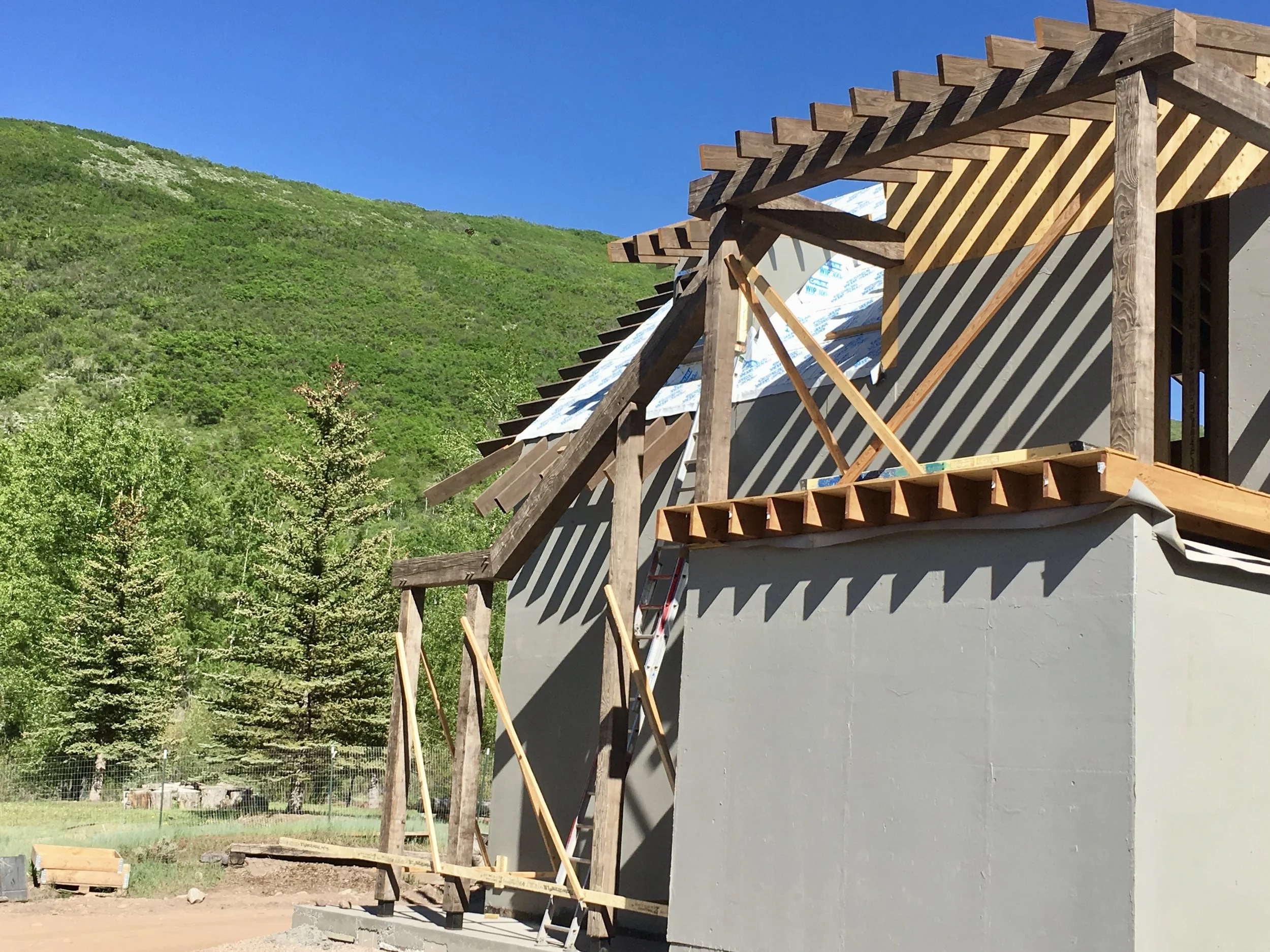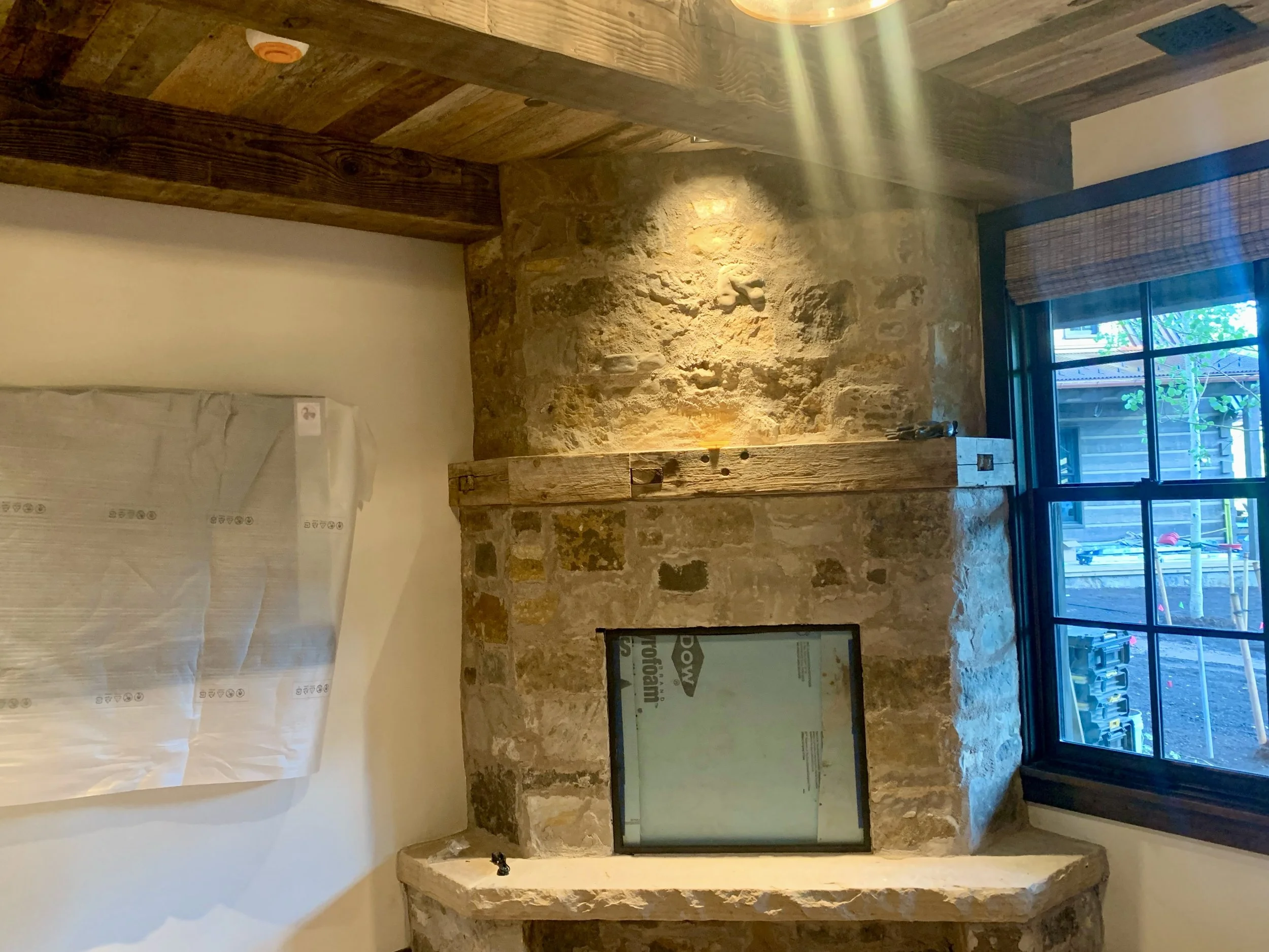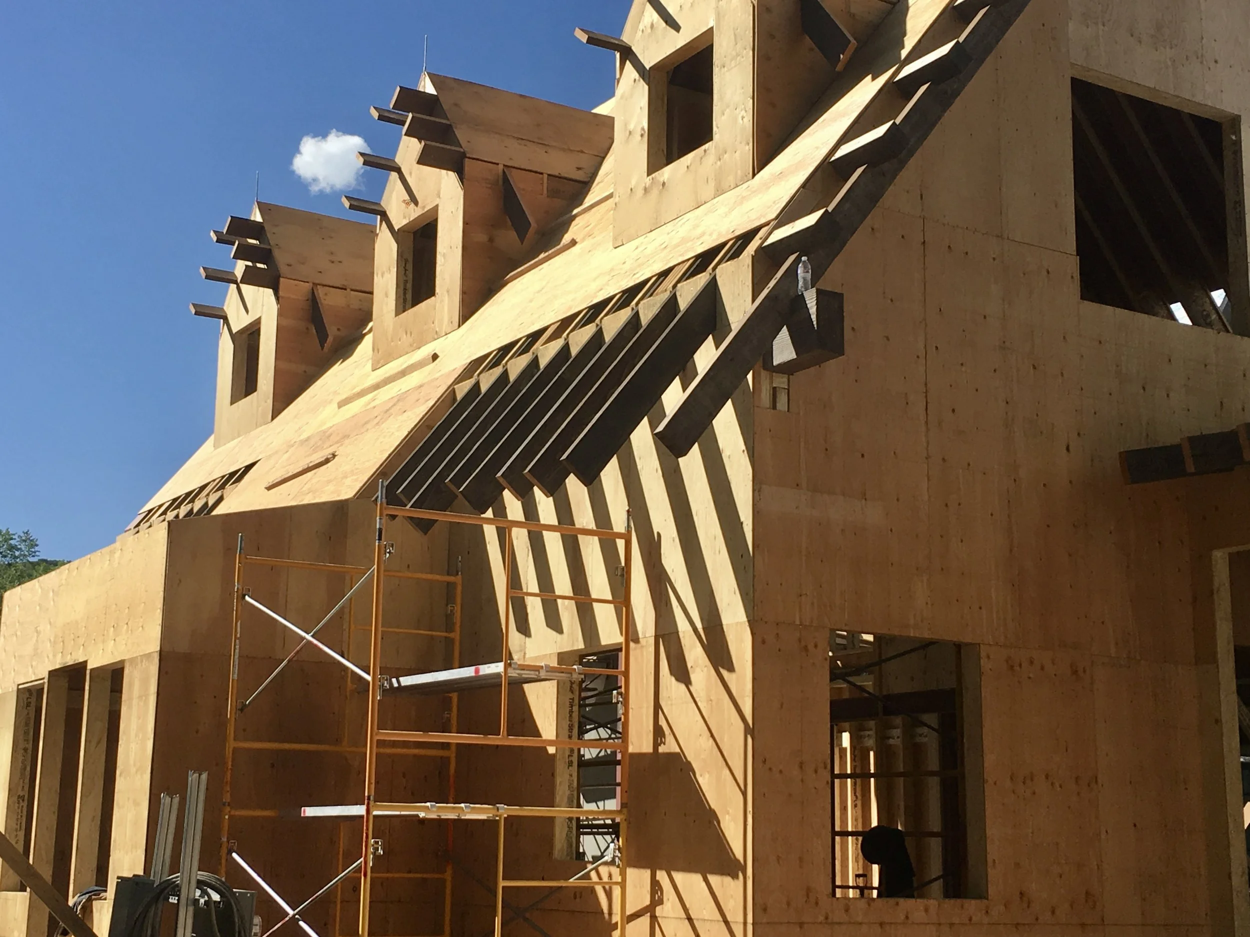 This cabin in Snowmass, Colorado, features a rustic design with wood siding and a stone chimney. Gabled roofs with dormer windows and a large front porch complete the mountain retreat look.